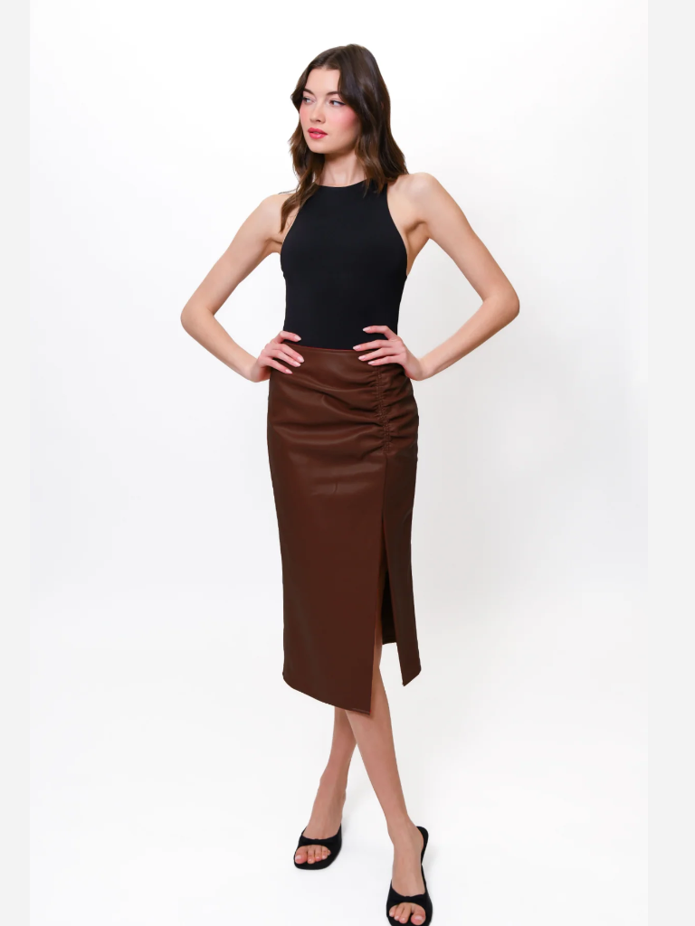 Elevate your wardrobe with the Nelly Skirt, crafted from chic faux leather for a bold, modern look. The ruched detailing adds flattering texture, while the slit at the hem offers a subtle yet alluring edge, perfect for day-to-night style. This skirt blends contemporary flair with effortless sophistication, making it a versatile essential for any fashion-forward closet.