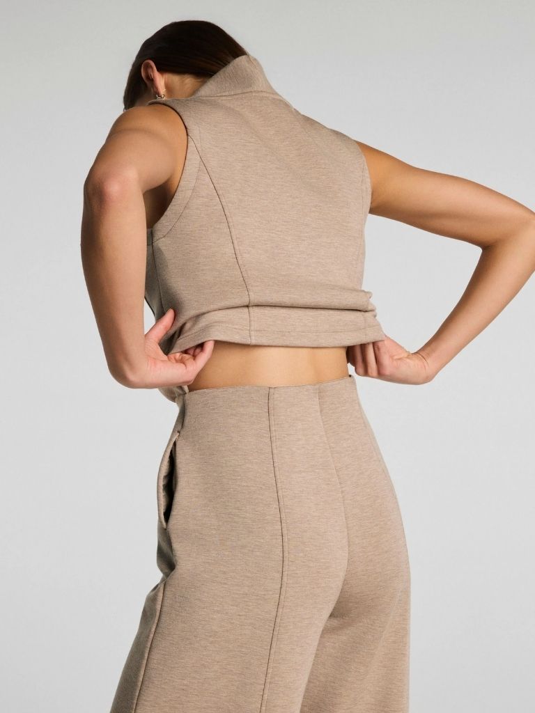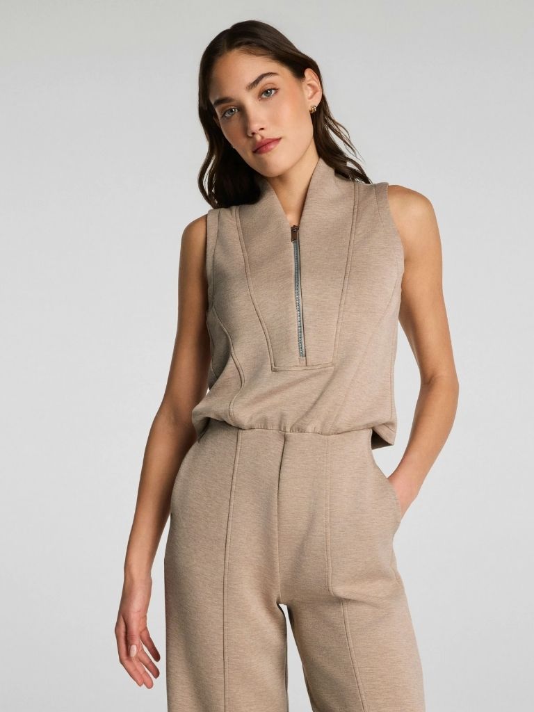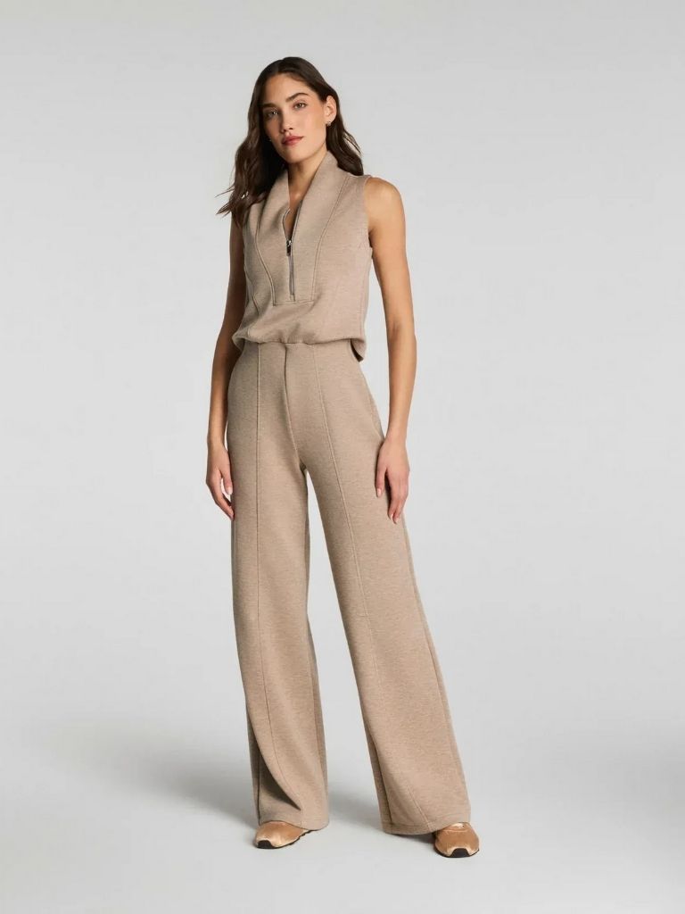Embody true sophistication in this silky knit jumpsuit. The wrap bodice, accented with contrasting leatherette trim and an elegant ornament detail, creates a striking focal point. Long sleeves and a wide-leg silhouette trimmed with leatherette along the length add bold definition, while the invisible back zipper ensures a seamless finish to this elevated design.