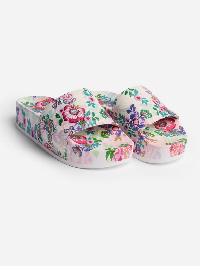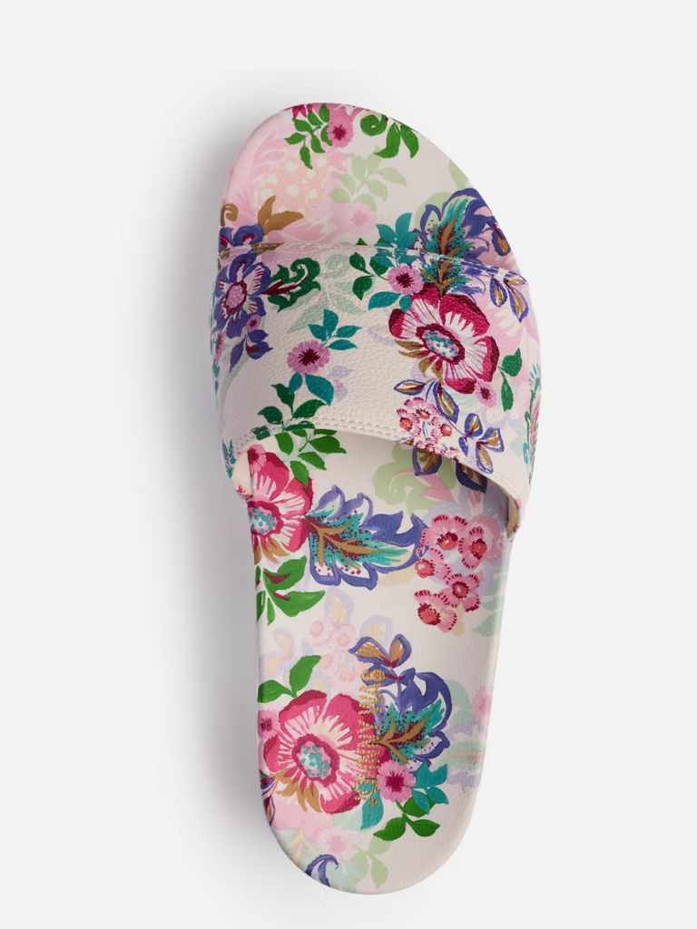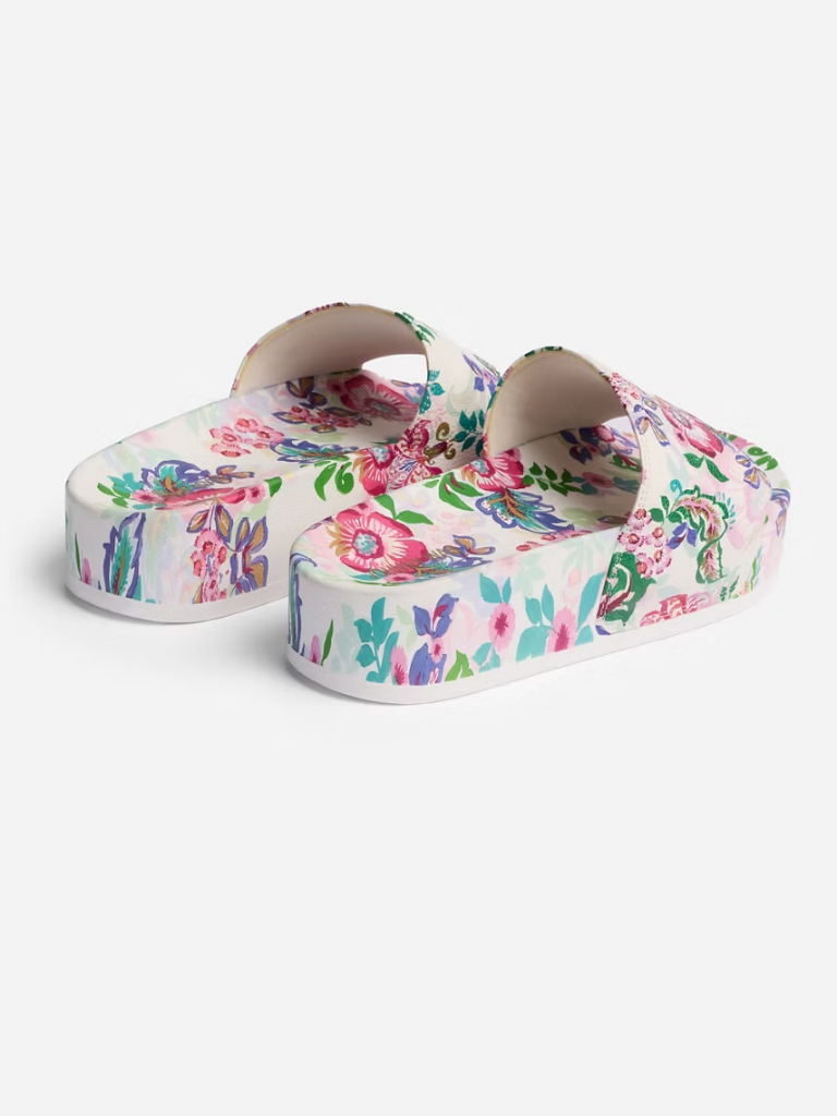 Embellished with vibrant color and a fresh floral pattern, the Melia Platform Pool Slides are essential to any vacation packing list. Thoughtfully crafted with a comfortable molded platform footbed, these easy slides are finished with a wide strap across the top.